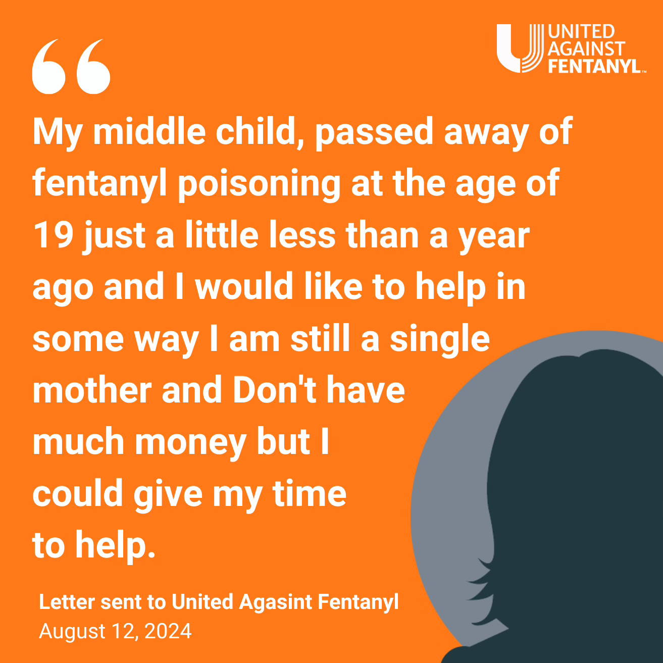 My middle child, NAME passed away of fentanyl poisoning at the age of 19 just a little less than a year ago and I would like to help in some way I am still a single mother and Don't have much money but I could give my time to help.